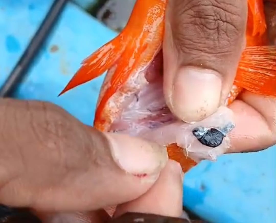 Ikan yang dipancing itu adalah jenis kerapu merah. Di dalam perut ikan tersebut ditemukan berisi kotoran atau seperti cacing seperti pasir besi halus. Warga belum megaku belum mengketahui secara pasti benda apa yang ada dalam perut ikan tersebut.