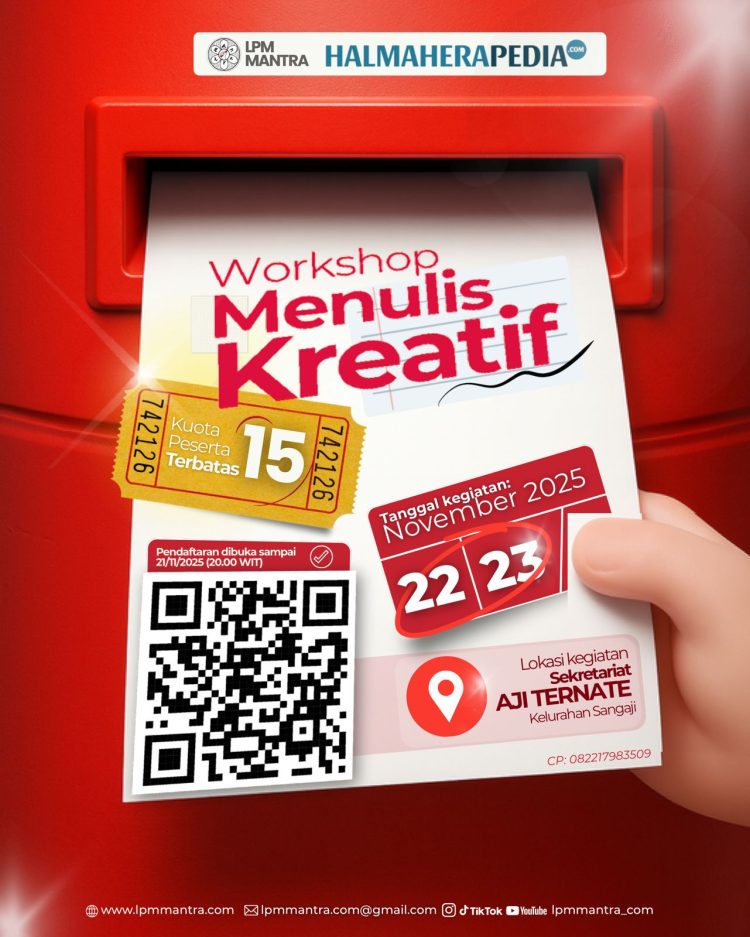Halmaherapedia- Untuk mingkatkan kemampuan menulis mahasiswa dan Lembaga Pers Mahasiswa (LPM), media online Halmaherapedia.com berkolaborasi dengan LPM Mantra Fakultas Ilmu Budaya (FIB) Universitas Khairun menggelar Workshop menulis. Kegiatan bertema “Menulis Kreatif” ini akan dilangsungkan selama dua hari, pada Sabtu (22/11/2025) sampai Minggu (23/11/2025) akhir pekan ini.