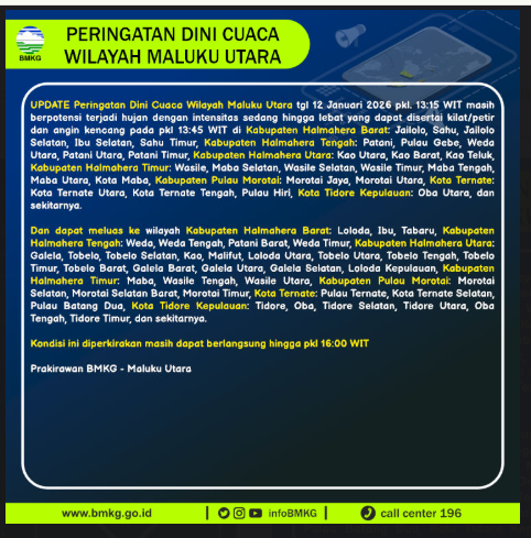 Halmaherapedia.com—  Badan Meteorologi Klimatologi dan Geofisika Kantor Stasiun Meteorologi (STAMET) Ternate mengeluarkan  peringatan dini kondisi cuaca  siang hingga sore nanti  sebagai berikut: