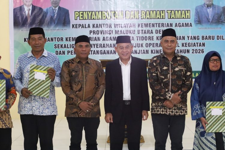 Halmaherapedia.com— Jajaran Kementerian Agama Provinsi Maluku Utara menggelar penandatanganan Perjanjian Kontrak Kerja dengan Kepala Kantor Agama Kota Tidore Kepulauan Rabu (14/1/2026). Kegiatan ini dihadiri langsung Kepala Kantor Wilayah Kementerian Agama Provinsi Maluku Utara H.Amar Manaf didampingi Kepala Bagian Tata Usaha (Kabag TU) H. Samsuddin Fathahuddin. Selain penandatanganan Perjanjian Kinerja juga dilakukan penyerahan Petunjuk Operasional Kegiatan (POK) sebagai bagian dari komitmen pelaksanaan program dan anggaran tahun berjalan.