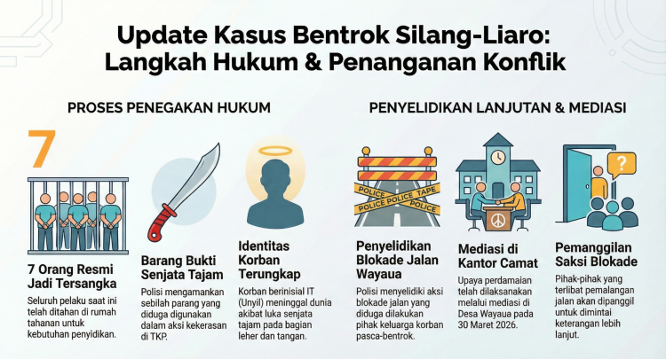 Halmaherpedia.com—Ternate– Bentrok antarwarga desa Silang dan Liaro di Bacan Timur Selatan Halmahera Selatan pihak kepolisian bergerak mengamankan sejumlah orang. Peristiwa pada Jumat (21/3/2026) sekitar pukul 16.00 WIT usai lebaran itu, menyebabkan salah satu warga Liaro berinisial IT alias Unyil tewas.Polisi lalu menangkap sejumlah orang yang diduga terlibat.