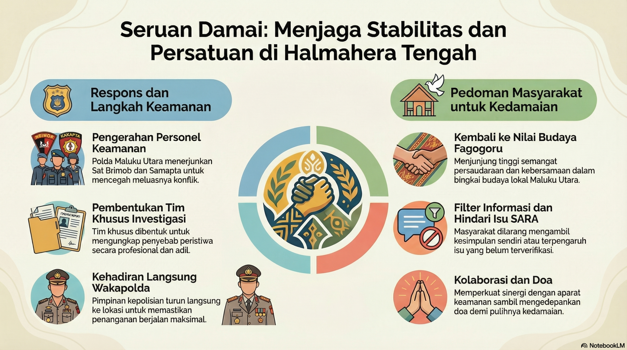 Kapolda Malut Irjen Pol. Drs. Waris Agono, mengambil langkah cepat dengan menerjunkan personel Sat Brimob dan Samapta untuk membantu pengamanan serta mencegah meluasnya konflik. Selain upaya pengamanan, Kapolda juga mengajak seluruh masyarakat, khususnya di Halmahera Tengah, tetap tenang dan menahan diri. Ia menekankan pentingnya menjaga persaudaraan dan tidak mudah terprovokasi isu-isu yang belum jelas kebenarannya.